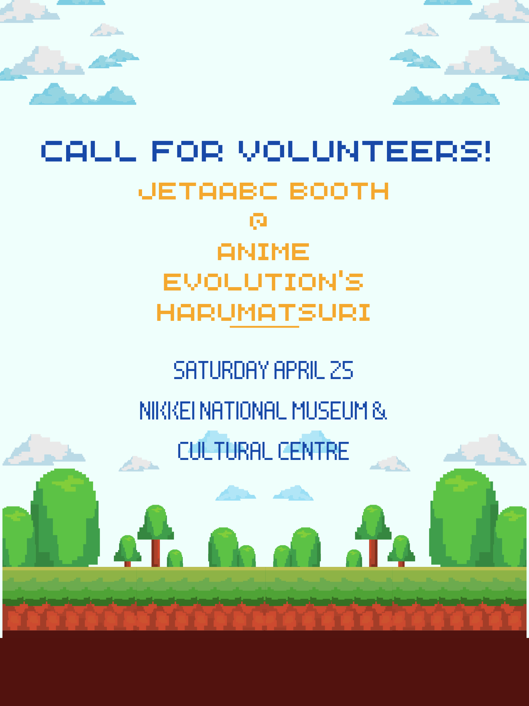 JETAABC will be boothing at Anime Evolution’s Harumatsuri on Saturday, April 25th. Join us at the Nikkei National Museum and Cultural Centre to promote the JET Programme and tourism to Japan!